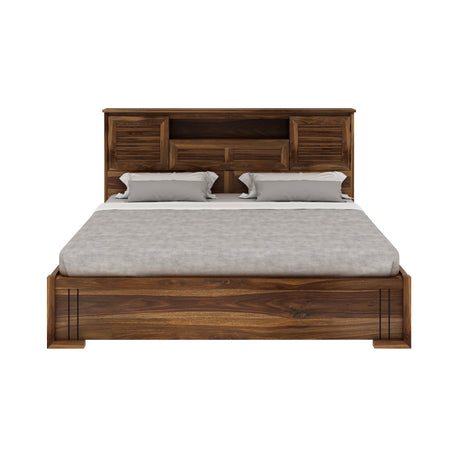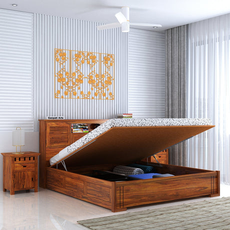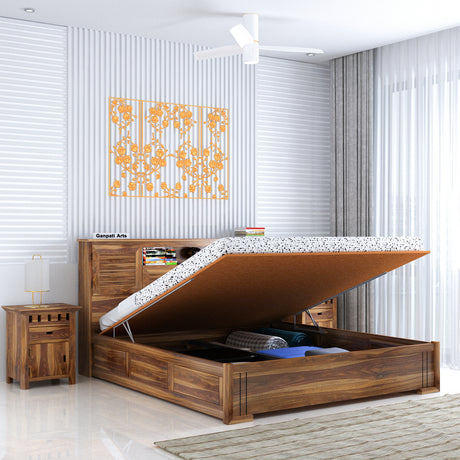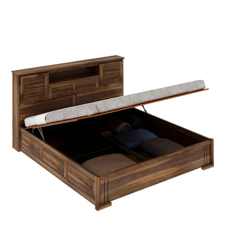 Maharaja Groove Solid Sheesham Wood Bed with Hydraulic Box and Headboard Storage - 3 years Warranty