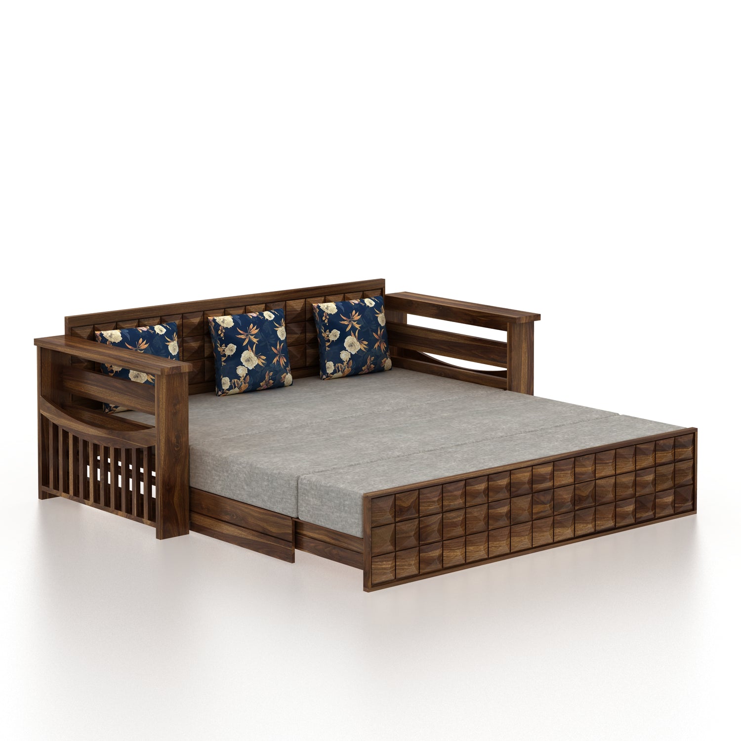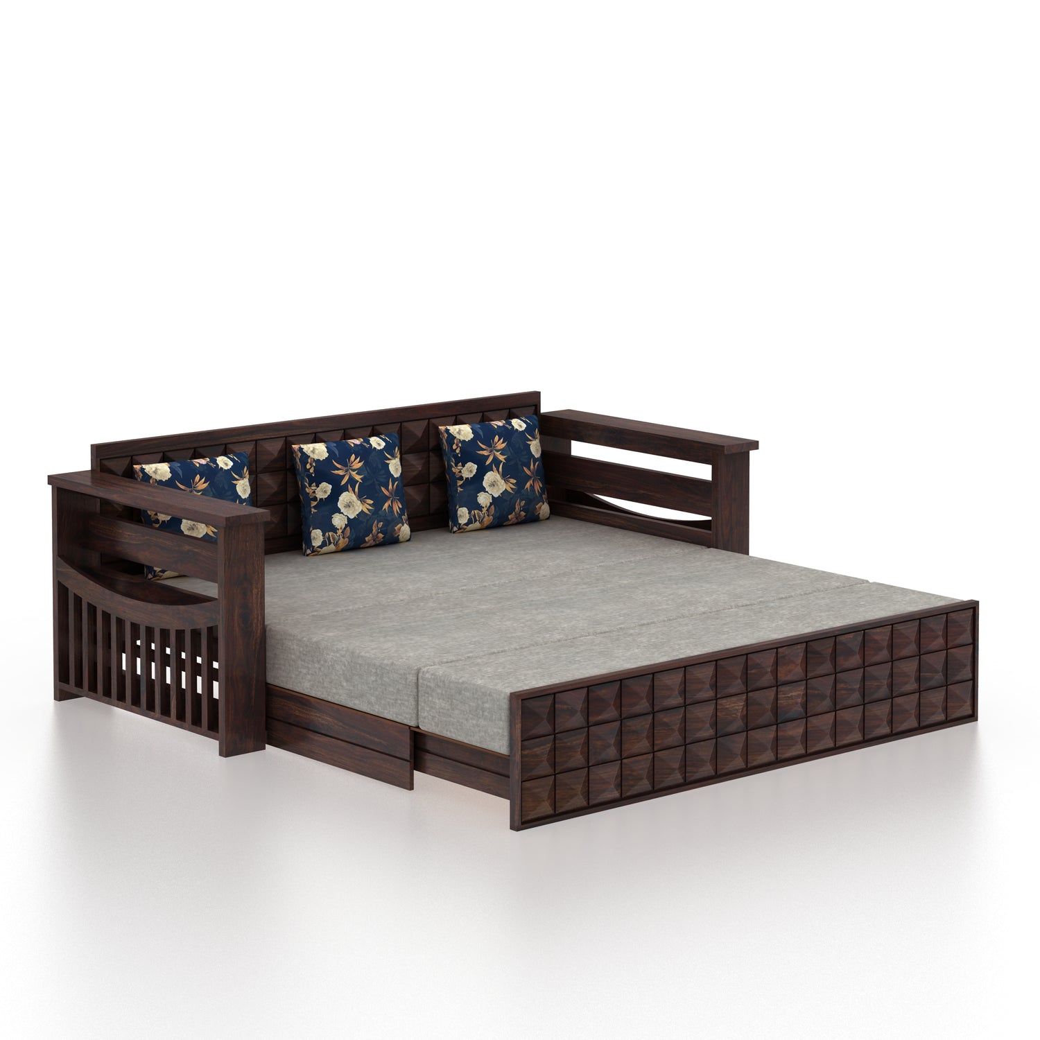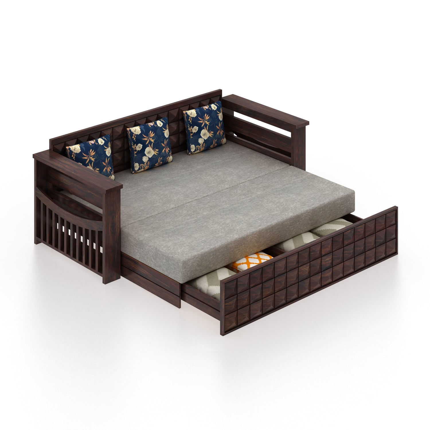 OSLO Solid Sheesham Wood 3 Seater Sofa Cum Bed With Headboard and Mini Storage - 3 Years Warranty